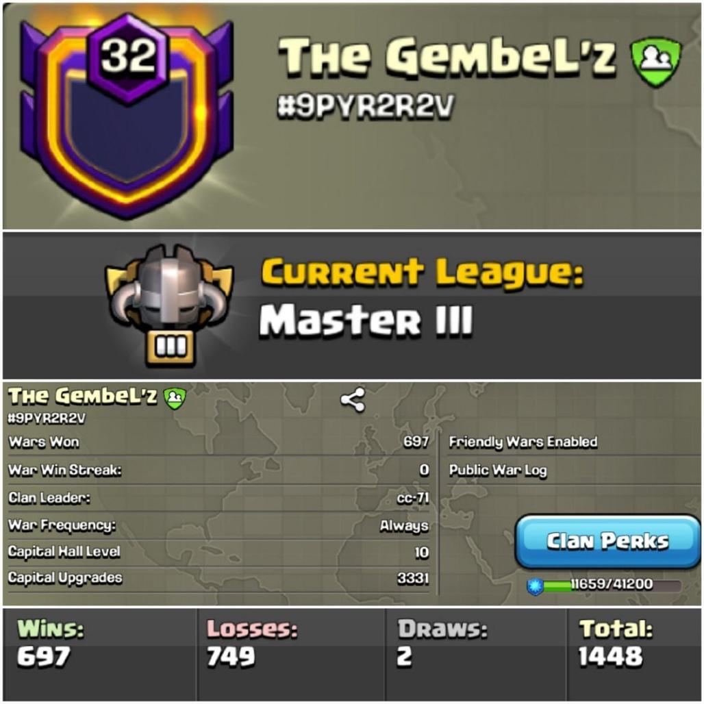 Level 32 clan || master 3 || clan capital 10 maxed 3331 upgrades || name - The GembeL'z