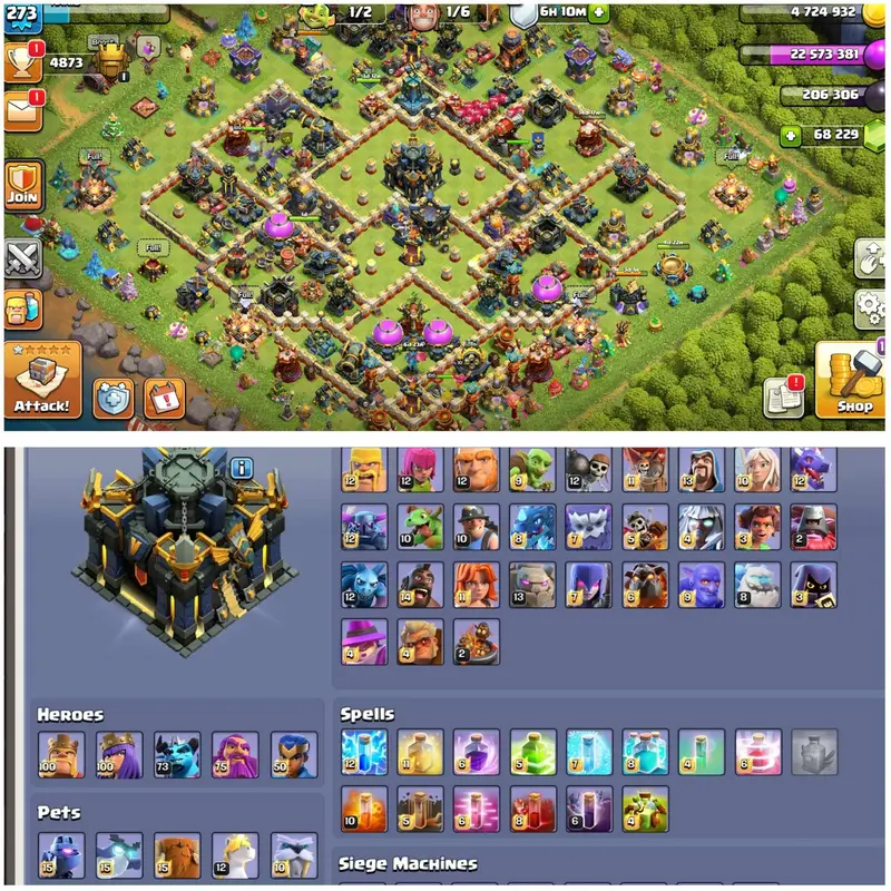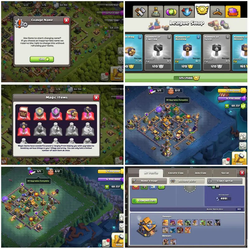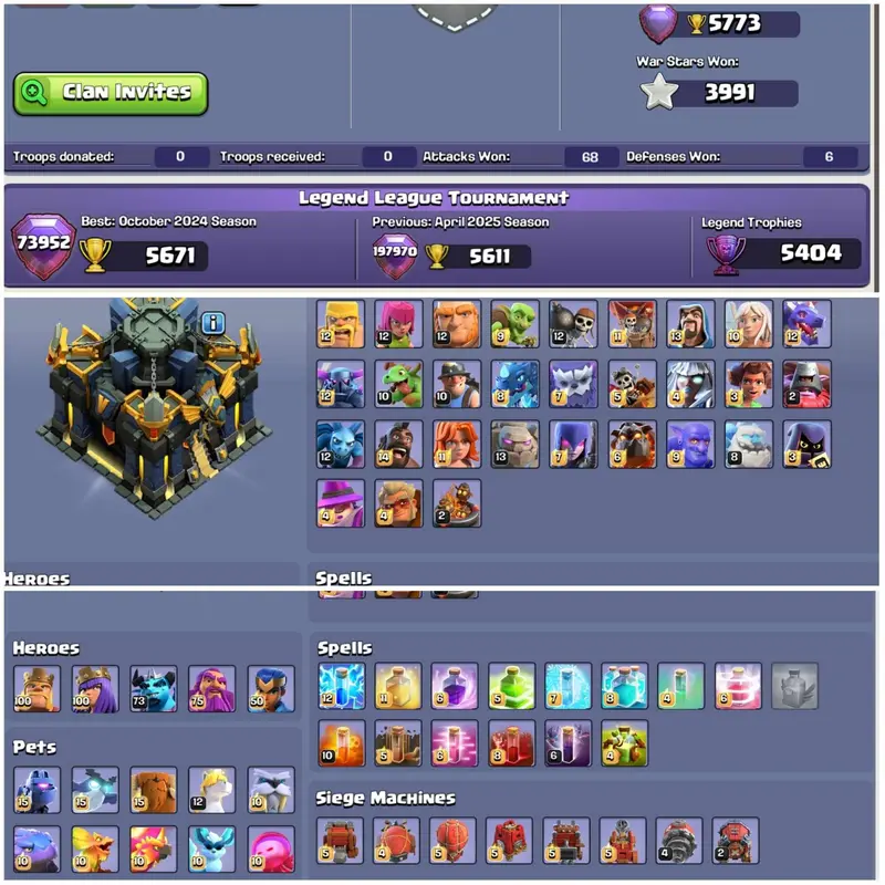 68.2k Gems||Th17 Almost Max||10 Epic Equipment ||6 Epic Almost Max||500 Nc||Full Max Builder Base||4k Ws||Exp 273