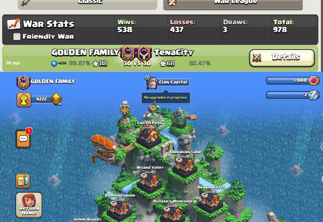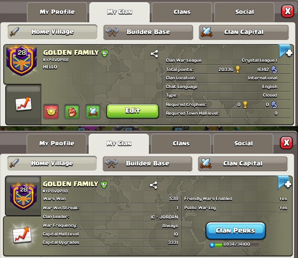 CLAN Level 28 | ENGLISH NAME CLAN : GOLDEN FAMILY | CLAN LEAGUE CRSYTAL 1 || CLAN CAPITAL 10 FULL MAX || POSITIVE WARLOG