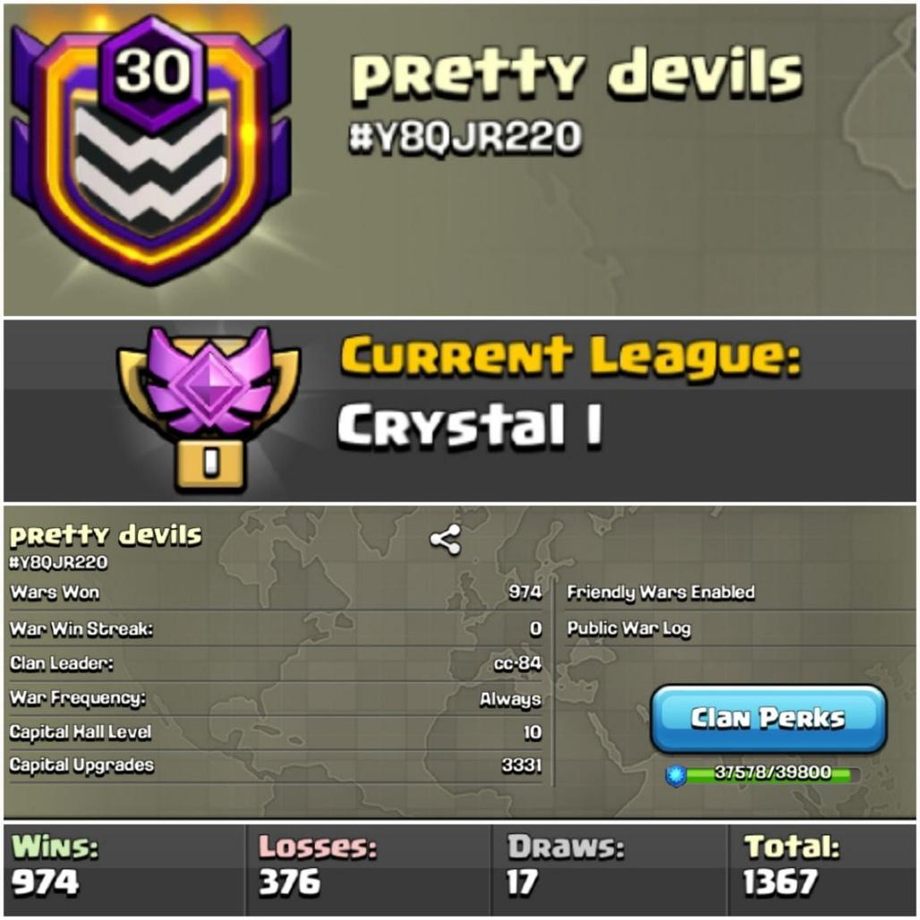 Level 30 clan || Name - pretty devils || clan capital 10 maxed 3331 upgrades || crystal 1 || best warlog 974-376